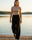 El palazzo está confeccionado en Chile con 100% algodón peruano, una fibra premium que se siente ligera, no tiene carda y ofrece una caída natural que estiliza sin apretar. Su estructura es firme, no se pega al cuerpo y mantiene el color y la forma tras los lavados.
